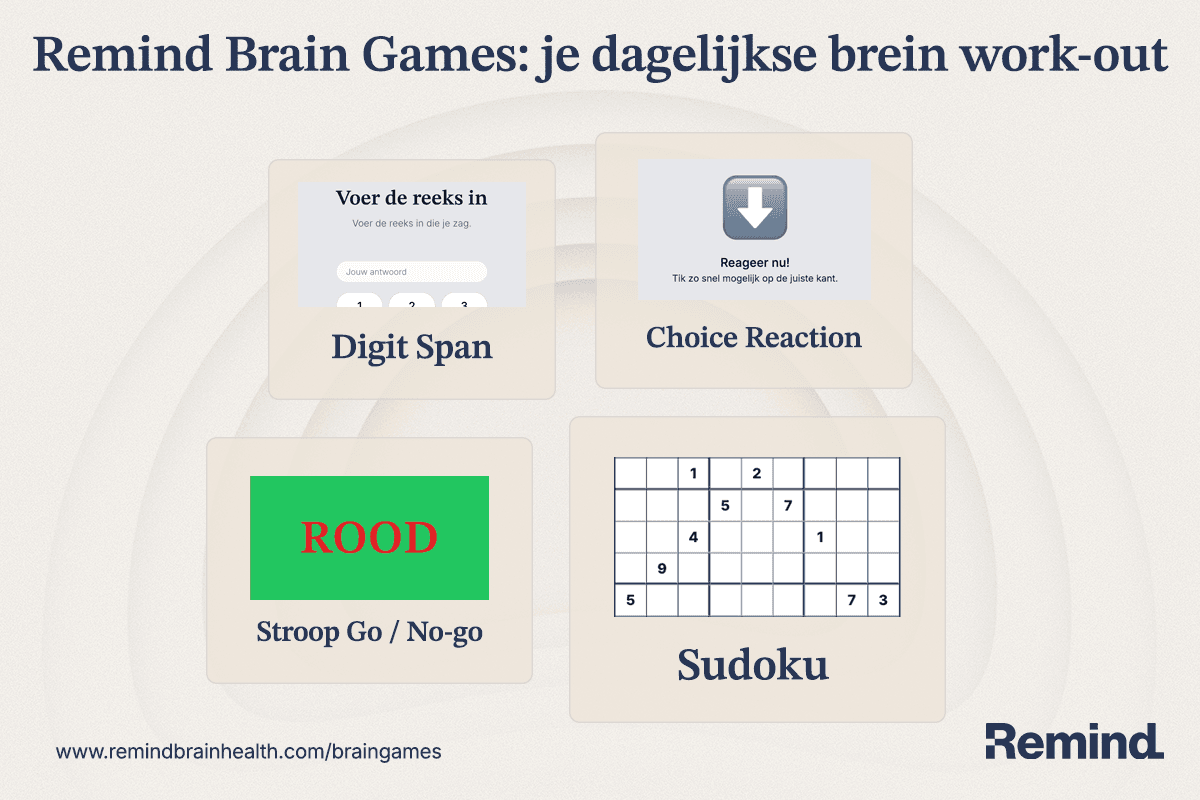 We hebben een selectie Brain Games ontwikkeld die zijn ontworpen om verschillende cognitieve functies te trainen. Deze zijn exclusief beschikbaar voor Remind+ gebruikers. Speel ze dagelijks hier!